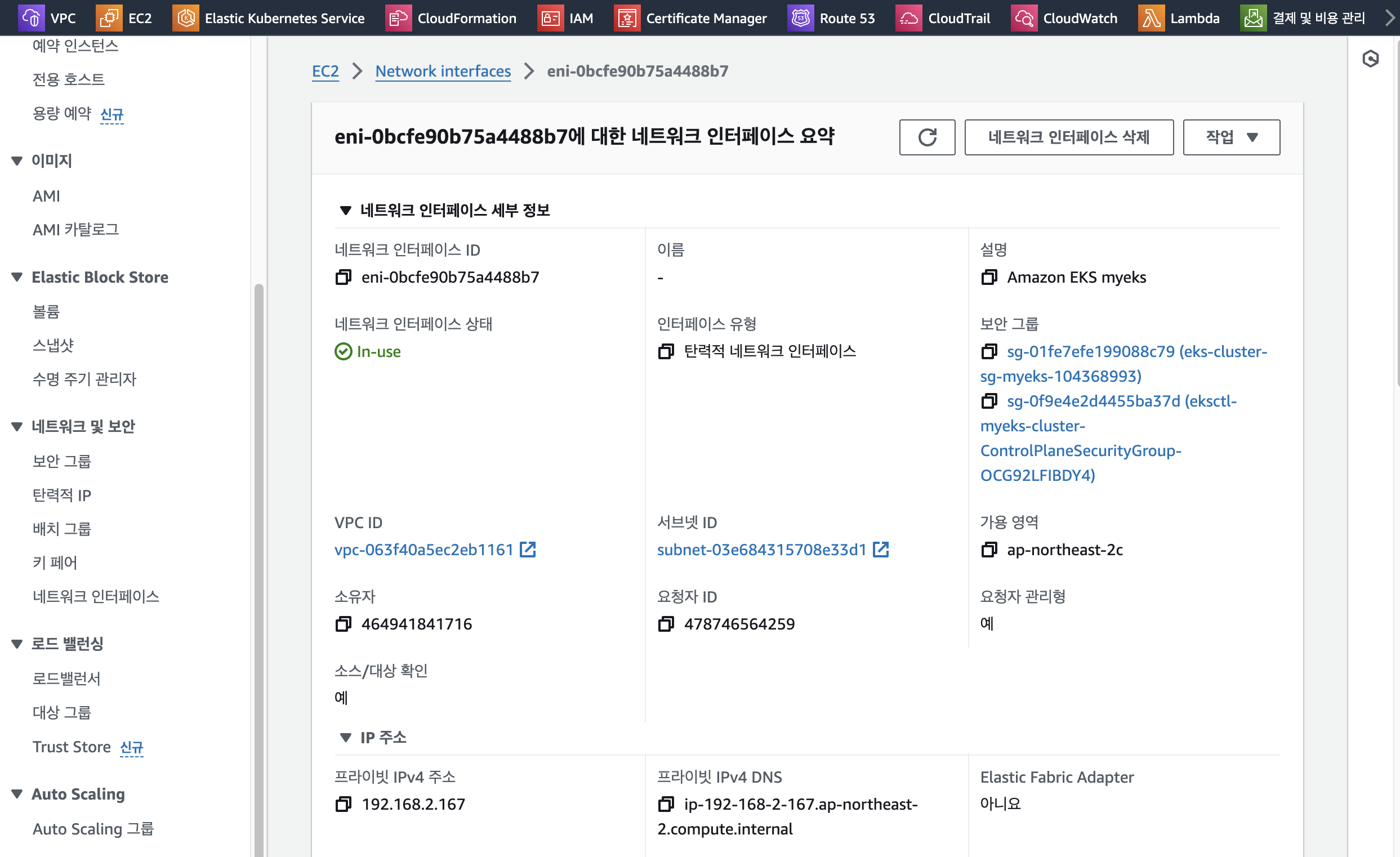 EKS owned ENI는 관리형 노드 그룹의 워커 노드는 내 소유지만, 연결된 ENI의 인스턴스는 AWS 소유라는 것을 알 수 있습니다.