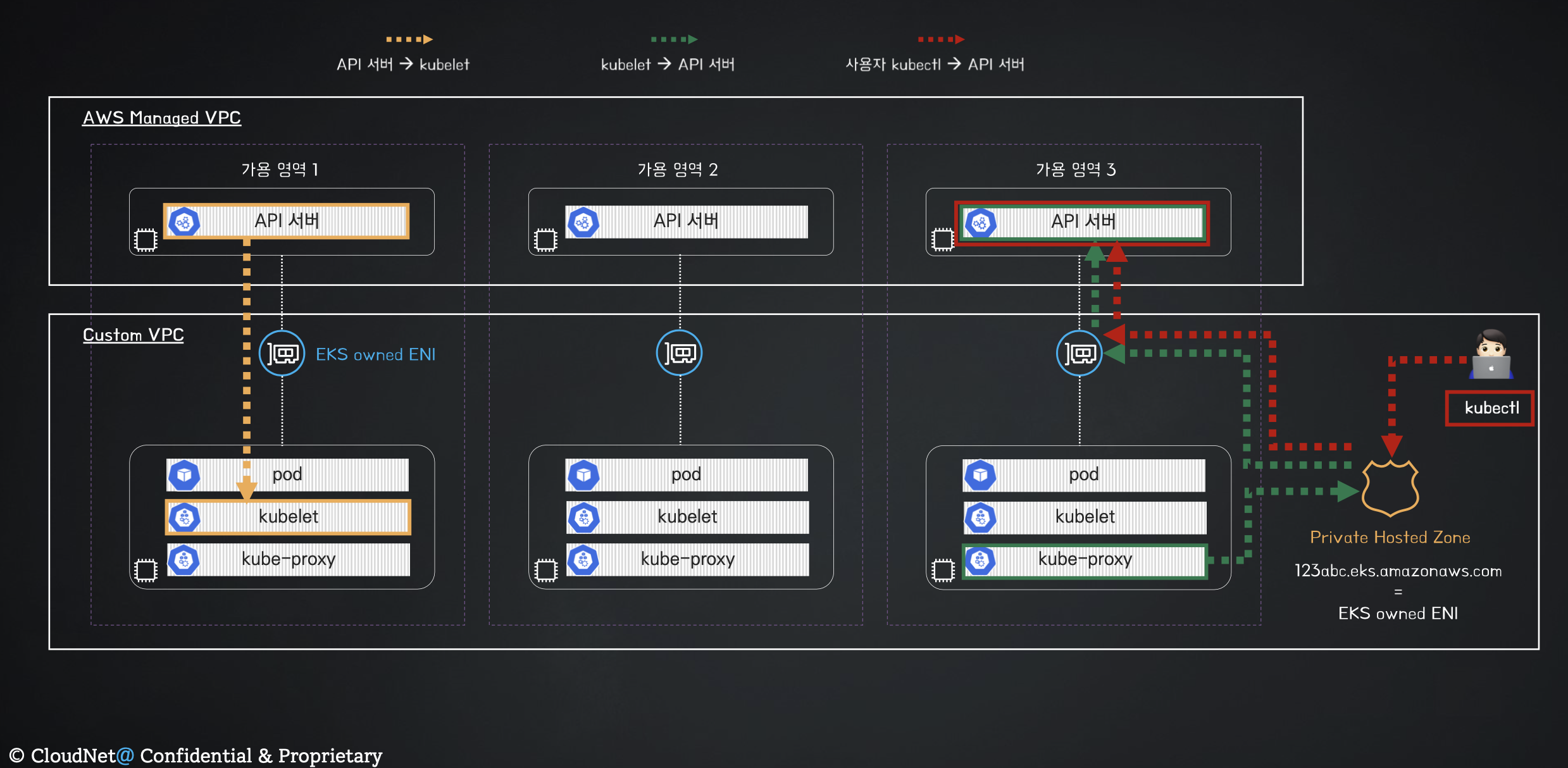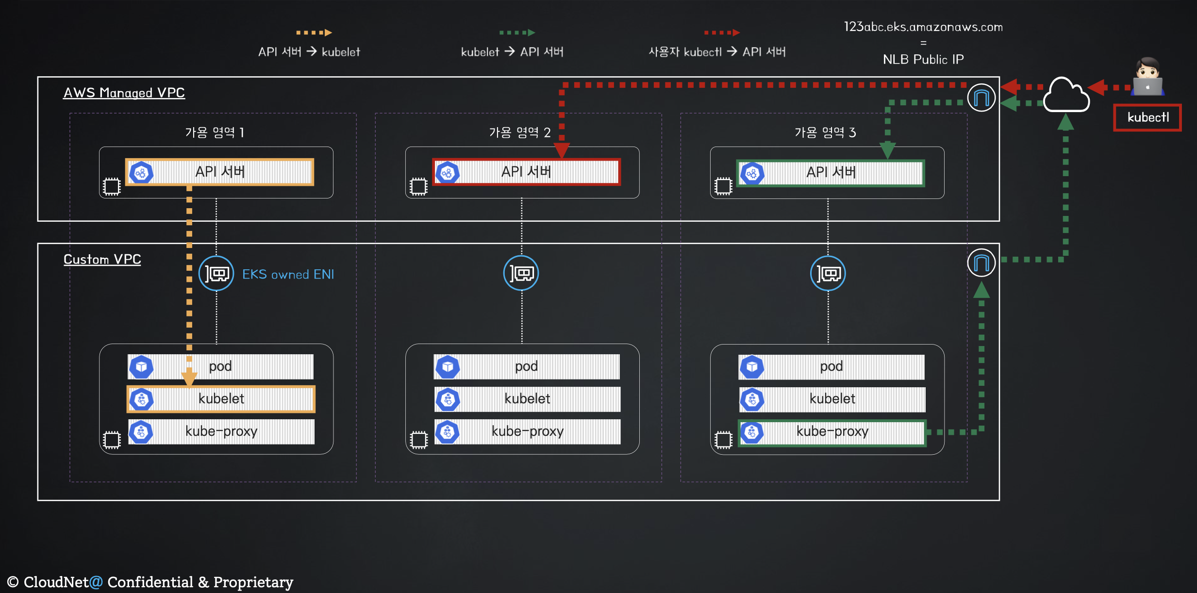 kube-proxy가 ENI를 통해서 내부에서 AWS Managed VPC로 통신합니다. 정확히 말씀드리면 이 VPC안에 API서버와 통신하는 것입니다.