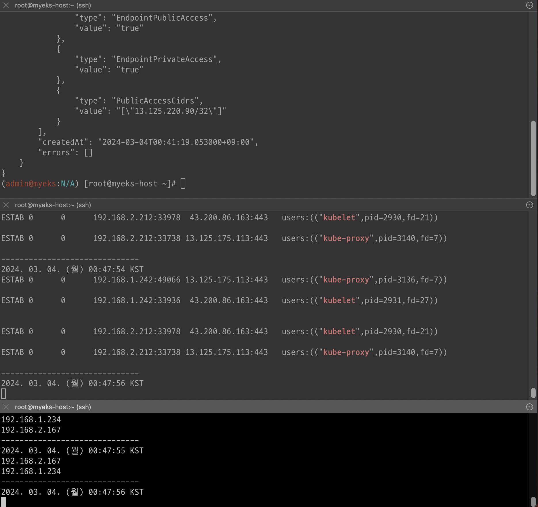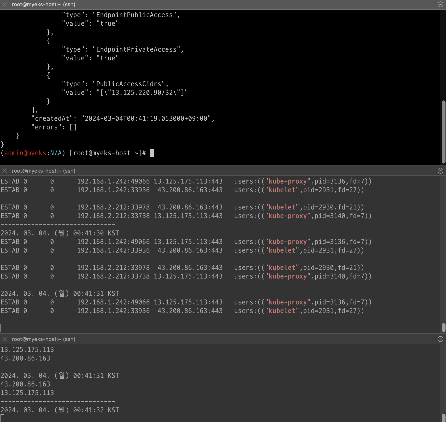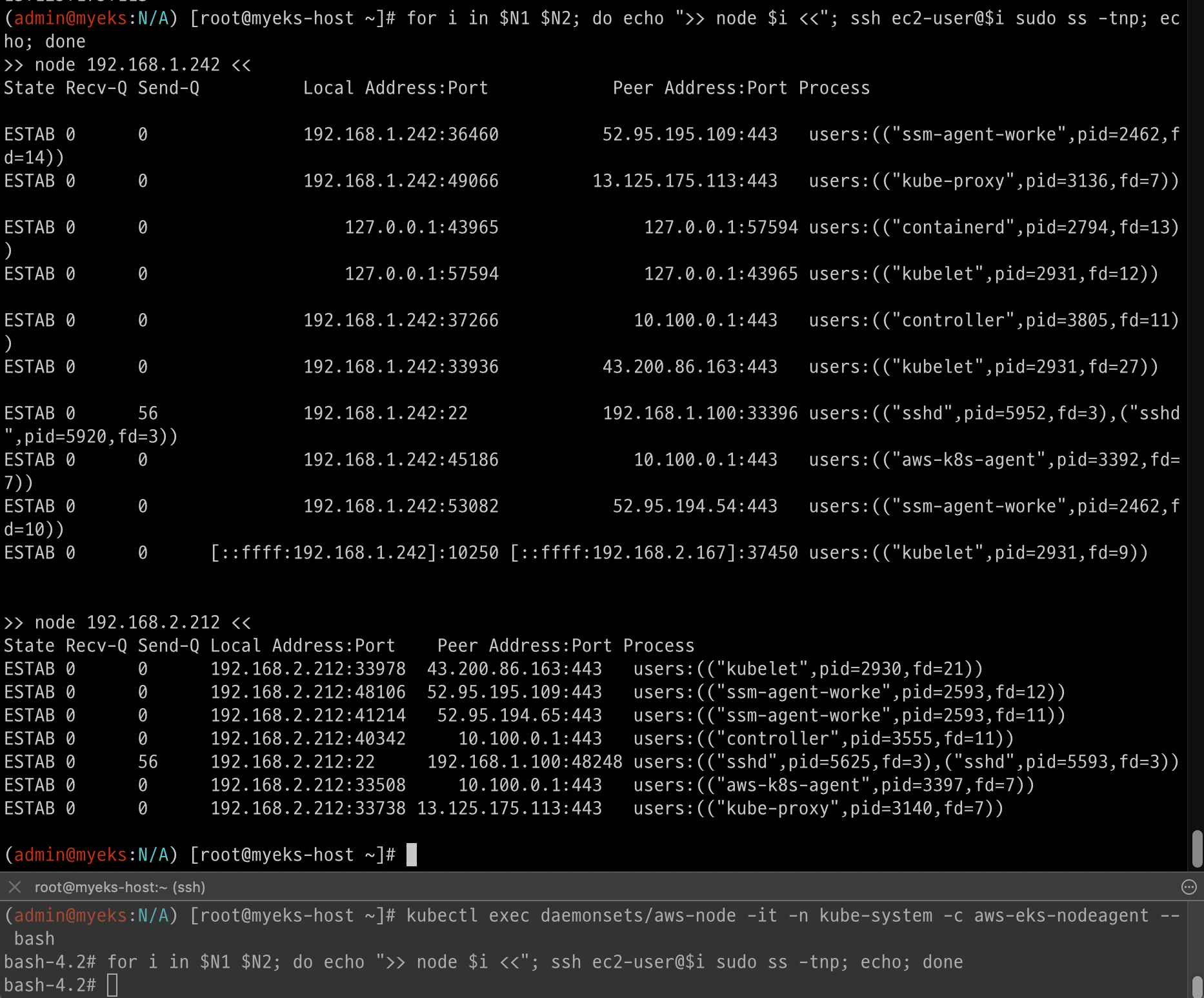 while true; do ssh ec2-user@$N1 sudo ss -tnp | egrep 'kubelet|kube-proxy' ; echo ; ssh ec2-user@$N2 sudo ss -tnp | egrep 'kubelet|kube-proxy' ; echo "------------------------------" ; date; sleep 1; done