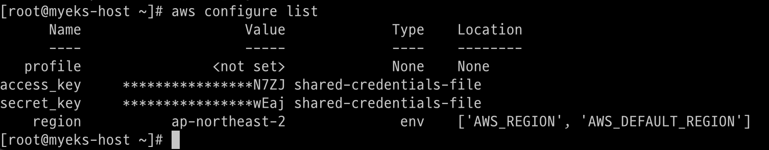 # IAM User 자격 구성 : 실습 편리를 위해 administrator 권한을 가진 IAM User 의 자격 증명 입력