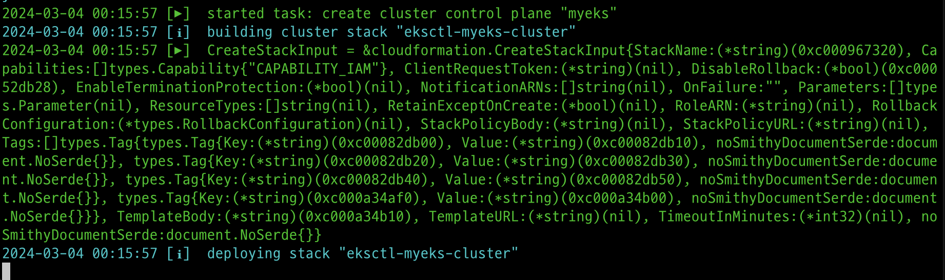 eksctl create cluster --name $CLUSTER_NAME --region=$AWS_DEFAULT_REGION --nodegroup-name=$CLUSTER_NAME-nodegroup --node-type=t3.medium \
