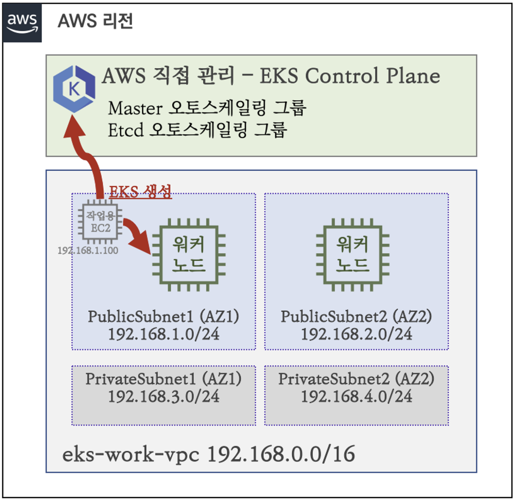 차이점은 AWS 가 Managed하는 부분입니다. 통상 마스터 노드라고 불리는 노드를 AWS가 운영 해주는 것입니다.