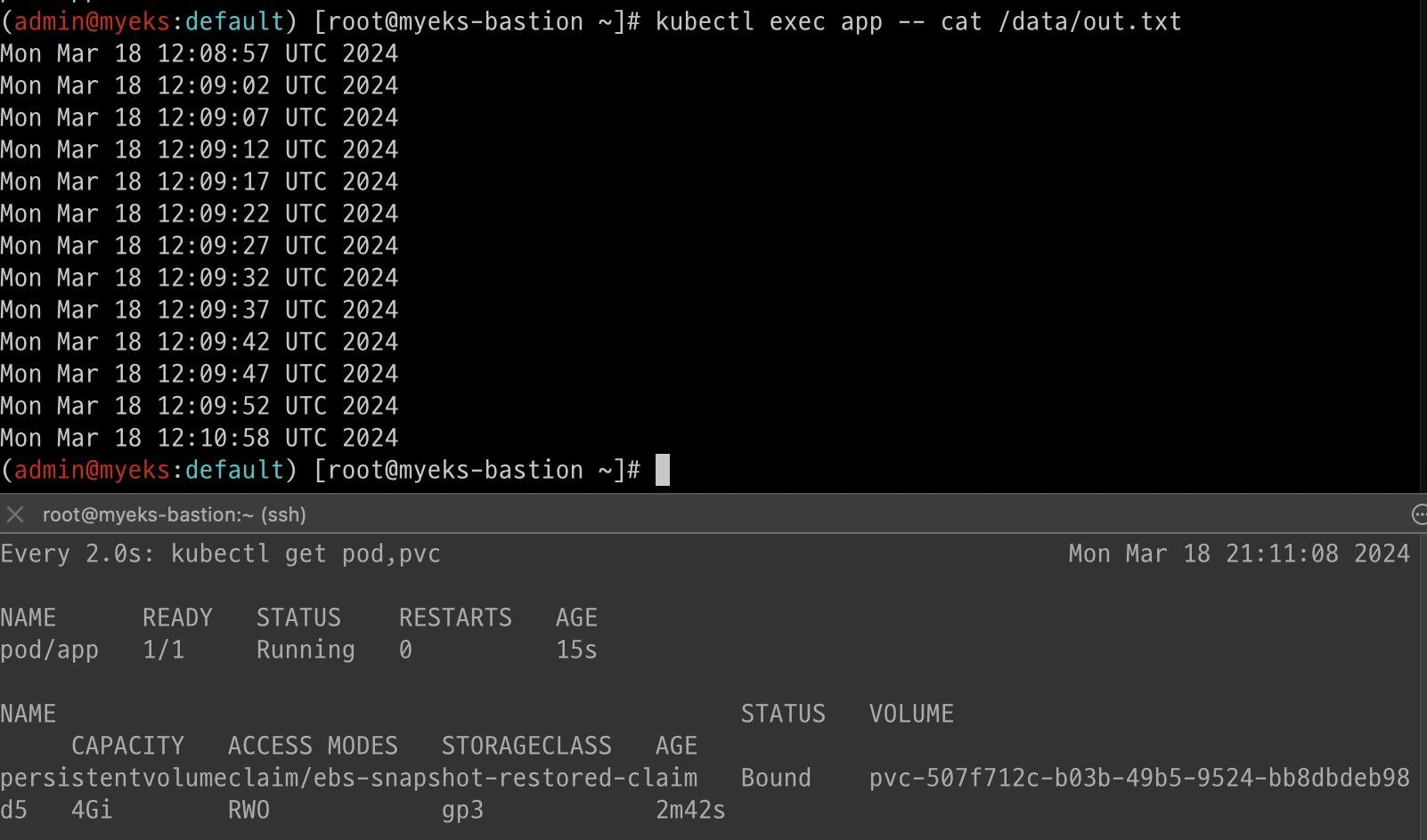 - "while true; do date >> /home/pod-out.txt; cd /home; sync; sync; sleep 10; done"