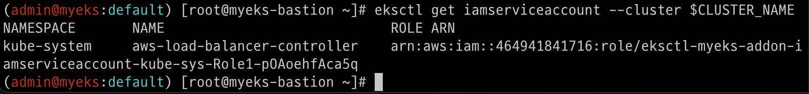 eksctl get iamserviceaccount --cluster myeks
