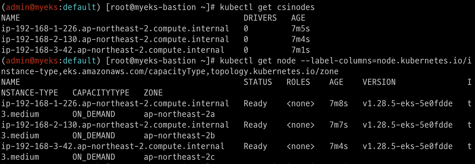 ip-192-168-1-65.ap-northeast-2.compute.internal Ready <none> 75m v1.28.5-eks-5e0fdde ON_DEMAND