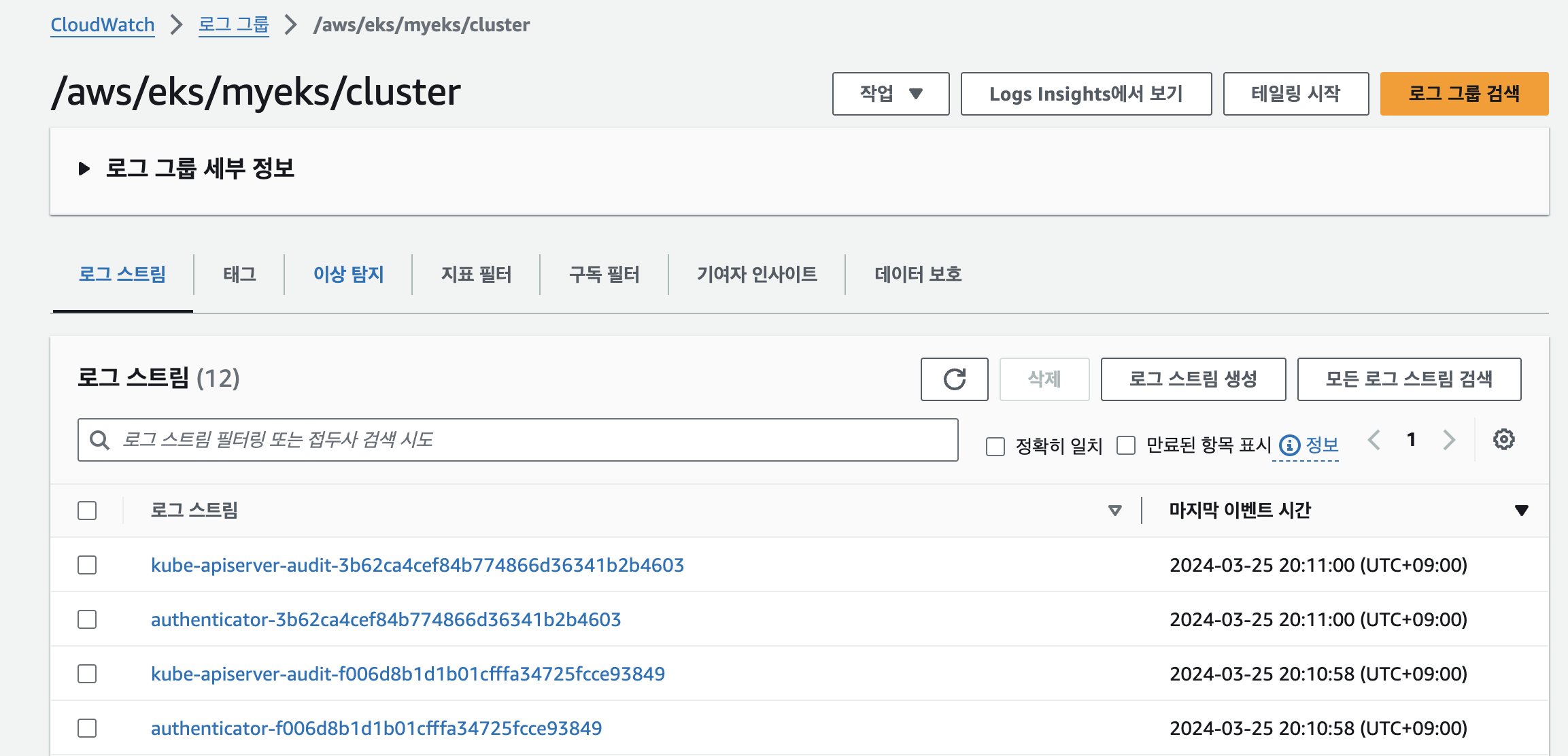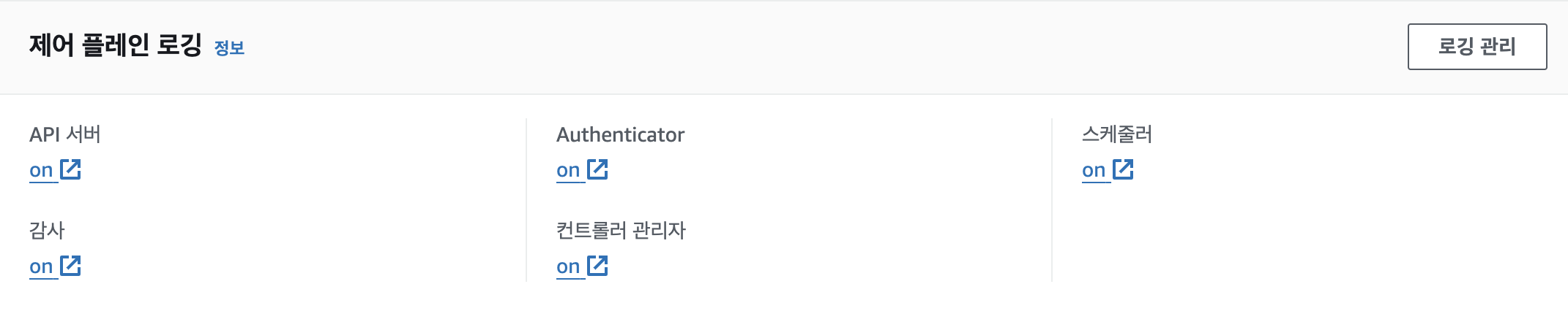 Control Plane logging : 로그 이름( /aws/eks/<cluster-name>/cluster ) - Docs