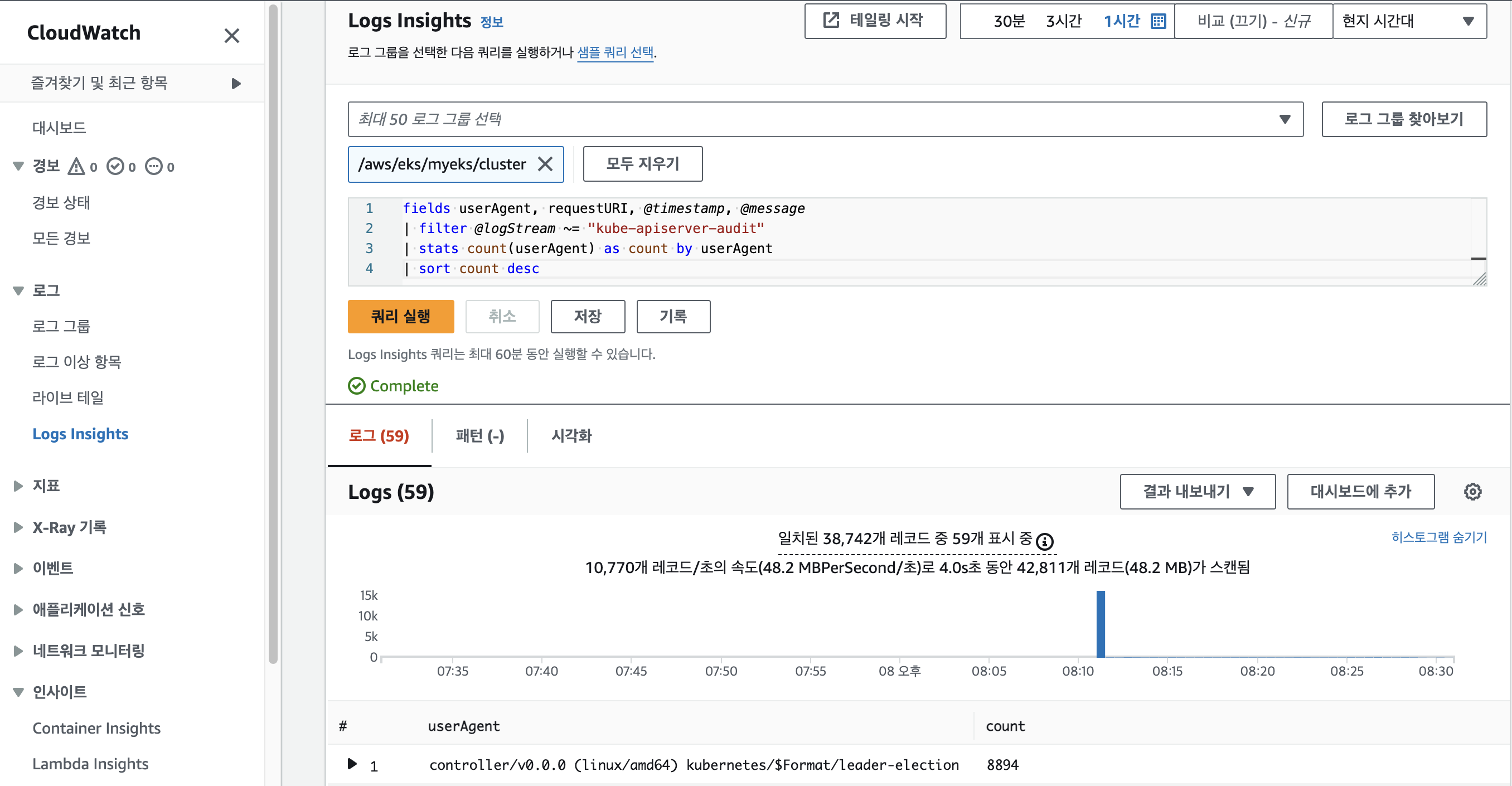 # 로그 그룹 선택 : /aws/containerinsights/<CLUSTER_NAME>/performance