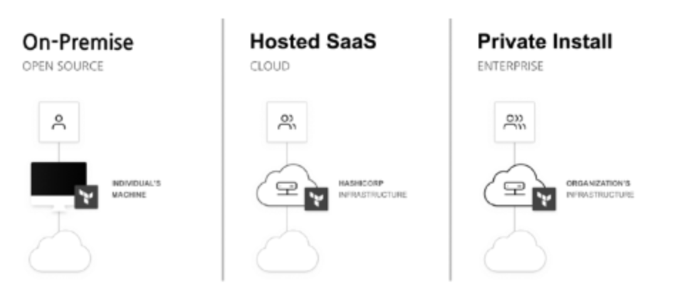 - Hosted SaaS : Terraform Cloud로 불리는 SaaS로 제공되는 구성 환경으로 하시코프가 관리하는 서버 환경이 제공