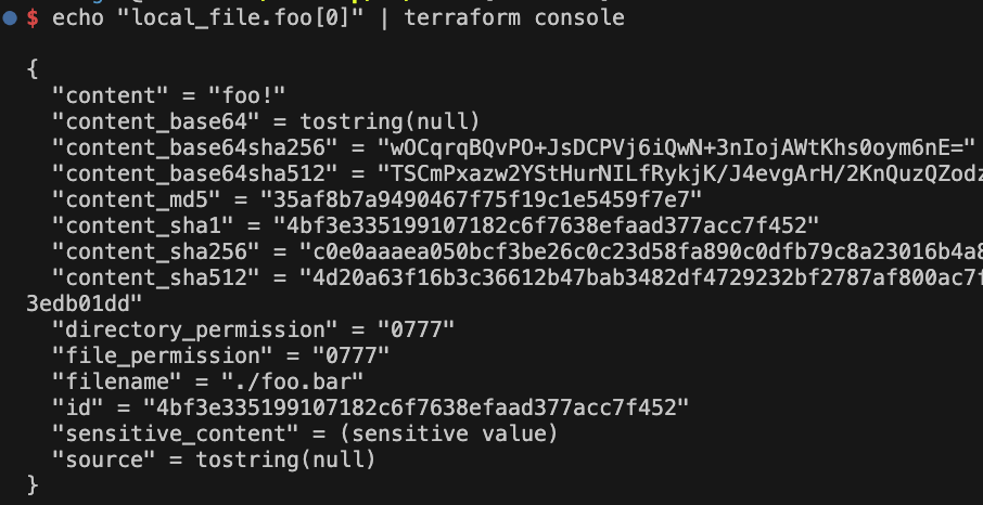echo "local_file.foo[0].content" | terraform console