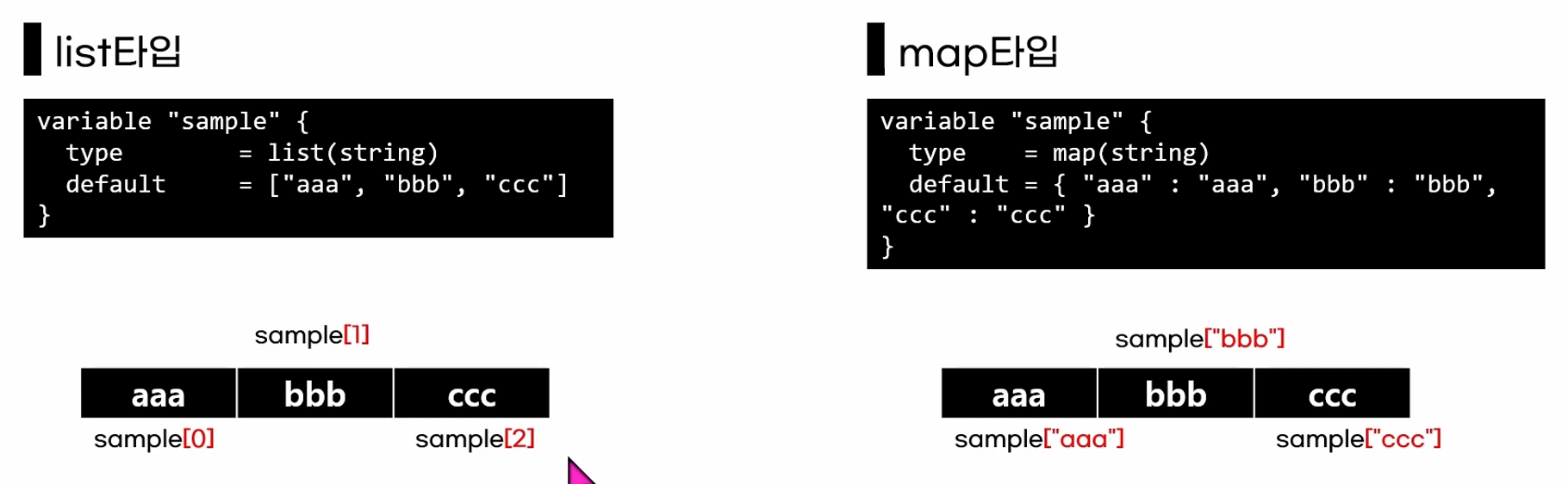 - map, set타입이 아닌 expression은 map 또는 set으로 타입변환(toset 등)을 해야합니다.