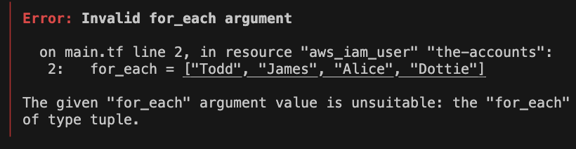 - 하지만 for_each는 모든 타입에 대해 each object로 접근 할 수 없고 map, set타입만 허용합니다.