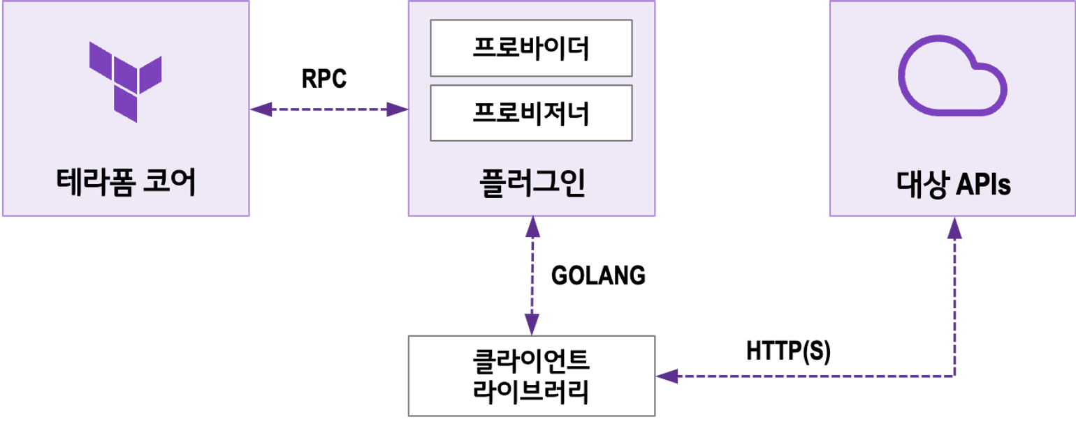 - 테라폼은 terraform 바이너리 파일을 시작으로 로컬 환경에나 배포 서버와 같은 원격 환경에서 원하는 대상을 호출하는 방식으로 실행된다. 이때 ‘원하는 대상’은 호출하는 방식이 서로 다르지만 대상의 공급자, 즉 프로바이더가 제공하는 API를 호출해 상호작용을 한다. 여기서 테라폼이 대상과의 상호작용을 할 수 있도록 하는 것이 ‘프로바이더’다.