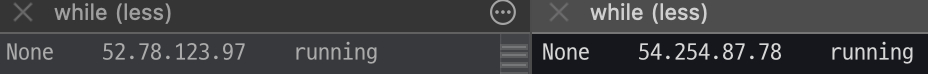 while true; do aws ec2 describe-instances --region ap-northeast-2 --query "Reservations[*].Instances[*].{PublicIPAdd:PublicIpAddress,InstanceName:Tags[?Key=='Name']|[0].Value,Status:State.Name}" --filters Name=instance-state-name,Values=running --output text ; echo "------------------------------" ; sleep 1; done