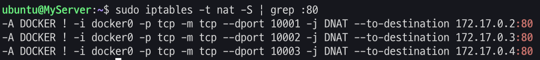 -A FORWARD -i docker0 -o docker0 -j ACCEPT # 컨테이너 끼리는 FORWARD 가 ACCEPT(허용)