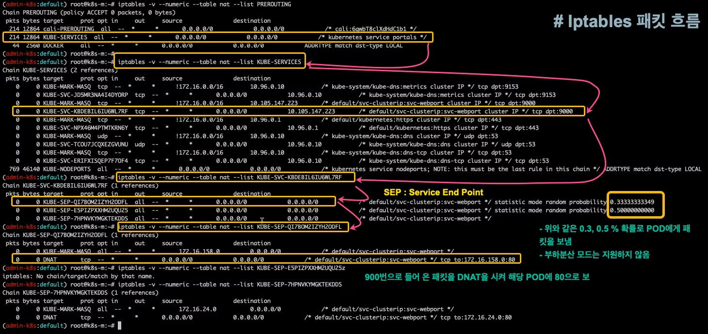 3.모드 노드(마스터 포함)에 iptables rule 이 설정되므로, 파드에서 접속 시 해당 노드에 존재하는 iptables rule 에 의해서 분산 접속이 됨