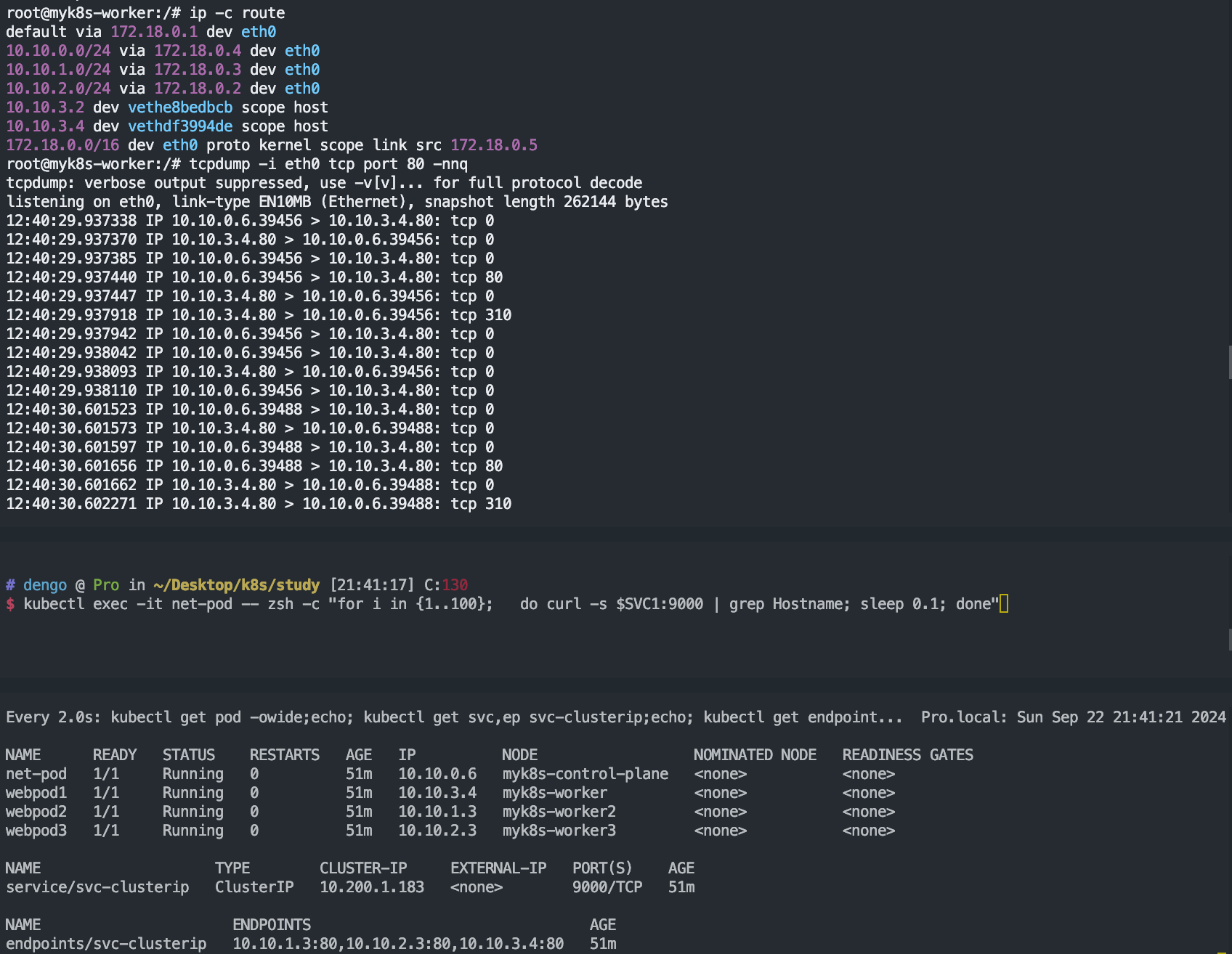 watch -d 'kubectl get pod -owide ;echo; kubectl get svc,ep svc-clusterip'