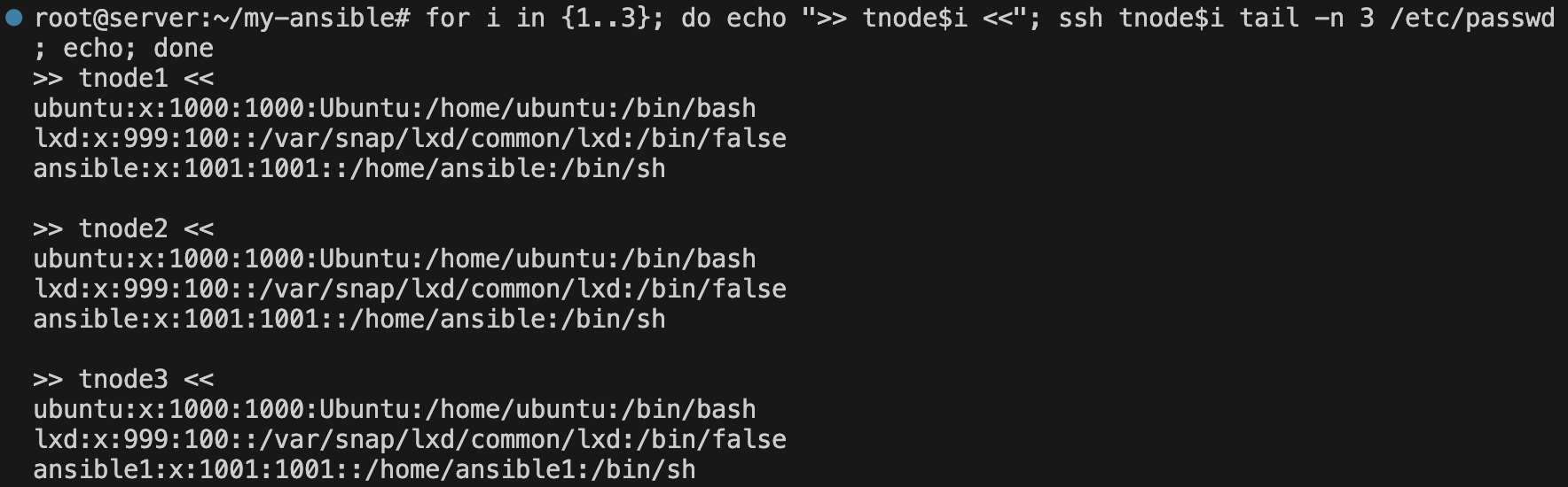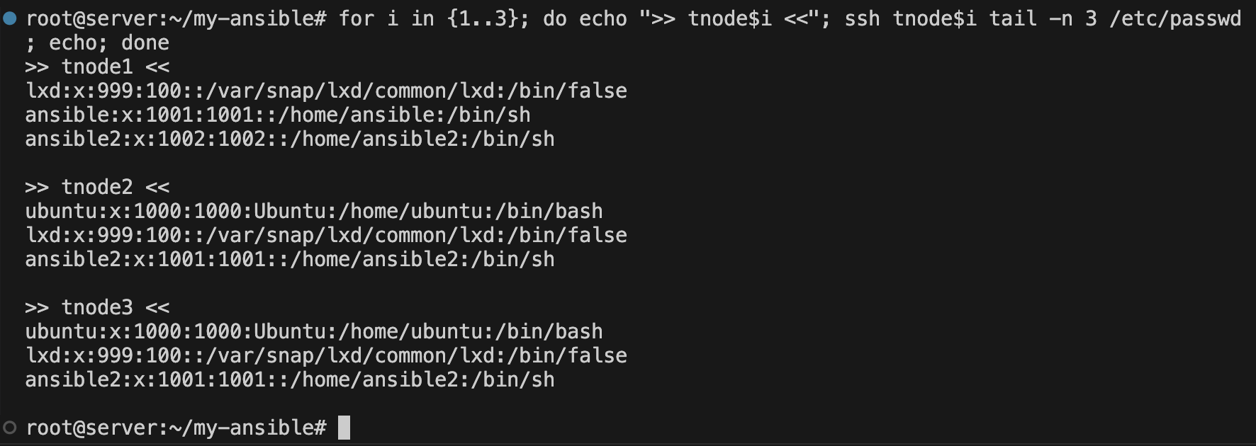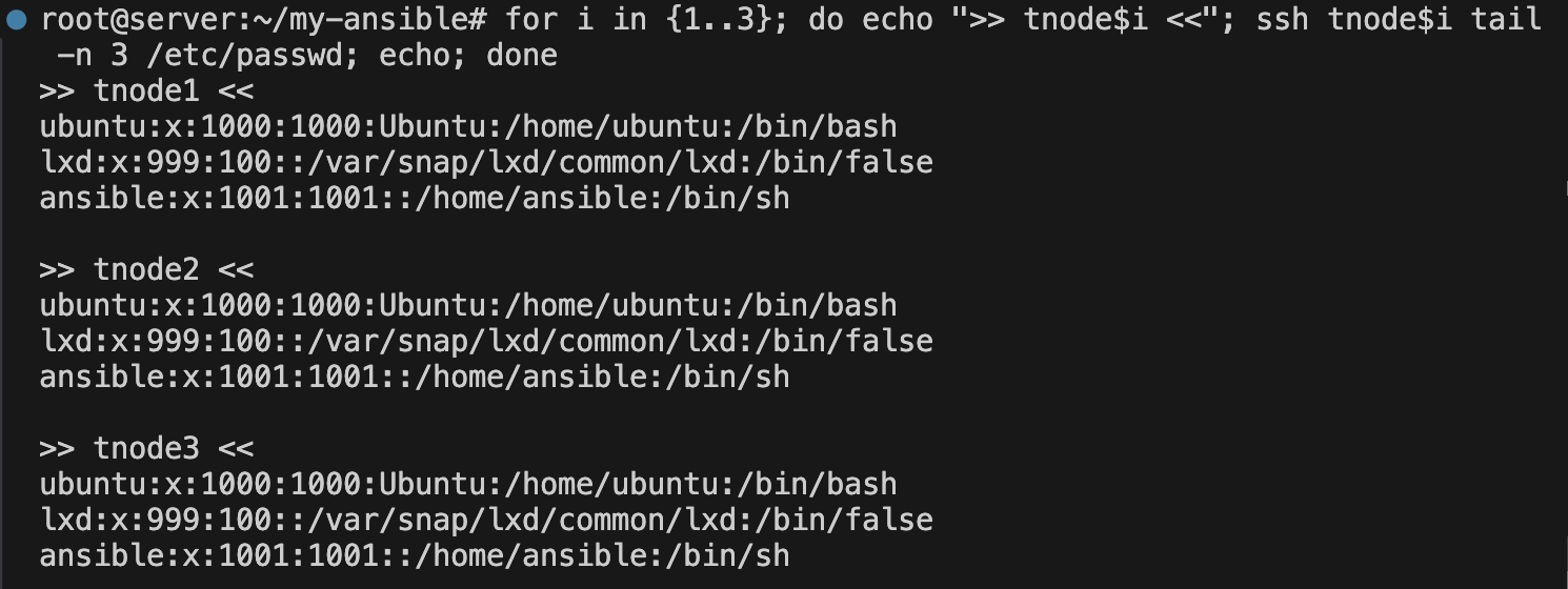 for i in {1..3}; do echo ">> tnode$i <<"; ssh tnode$i cat ~/.ssh/authorized_keys; echo; done