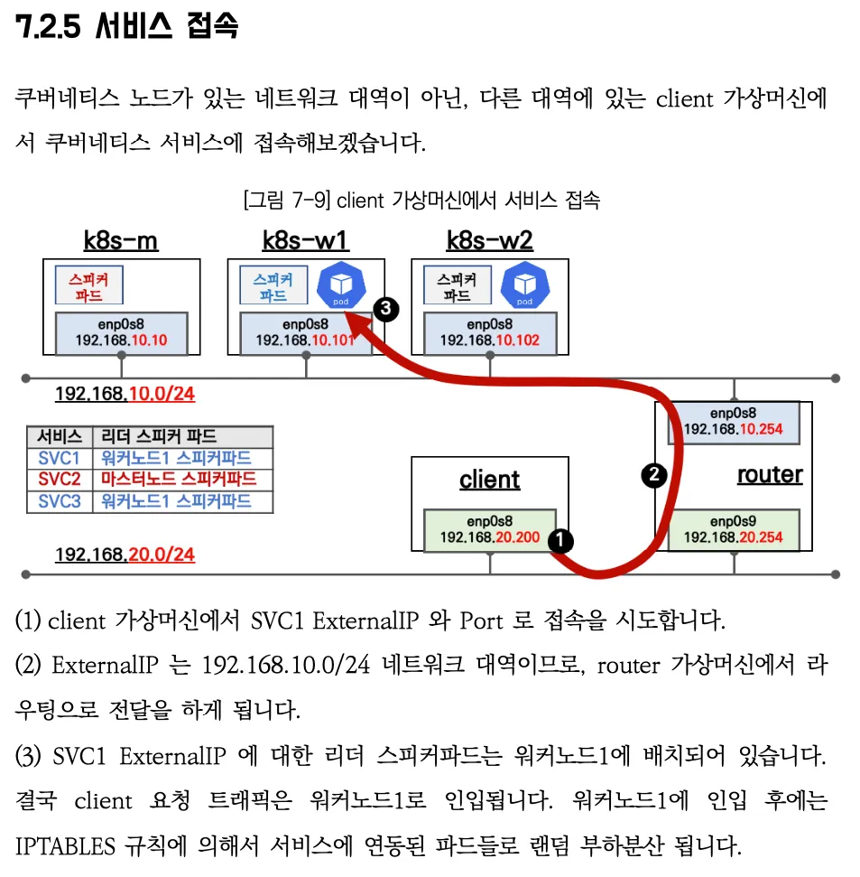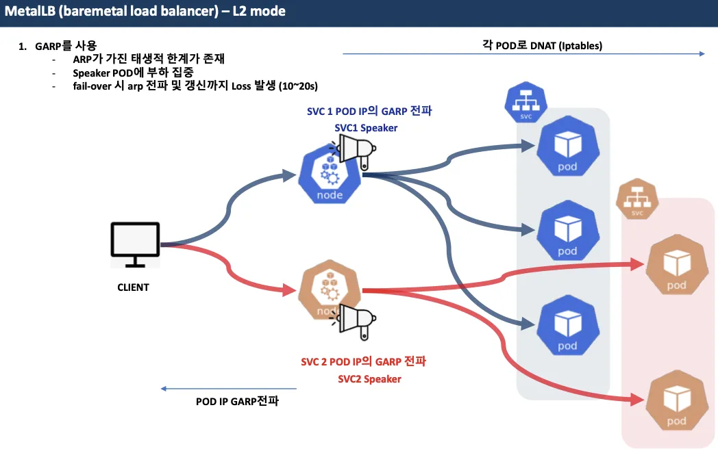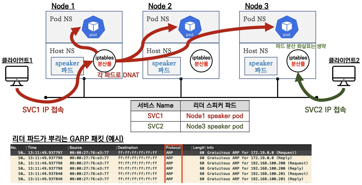 - 서비스(로드밸런서) 'External IP' 생성 시 speaker 파드 중 1개가 리더가 되고, 리더 speaker 파드가 존재하는 노드로 서비스 접속 트래픽이 인입되게 됩니다