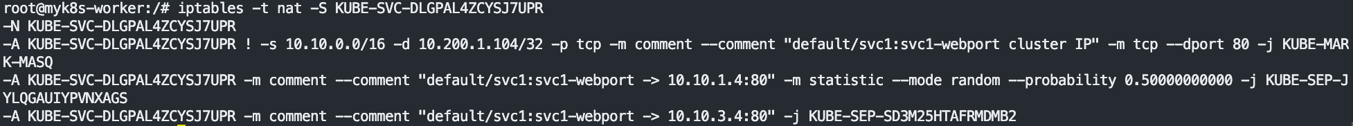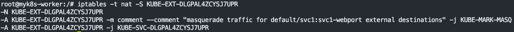 for i in filter nat mangle raw ; do echo ">> IPTables Type : $i <<"; docker exec -it myk8s-worker2 iptables -t $i -S ; echo; done