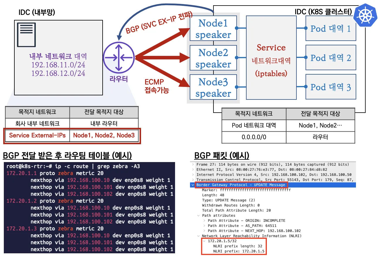 speaker 파드가 BGP로 서비스 정보(EXTERNAL-IP)를 전파 후, 외부에서 라우터를 통해 ECMP 라우팅으로 부하 분산 접속