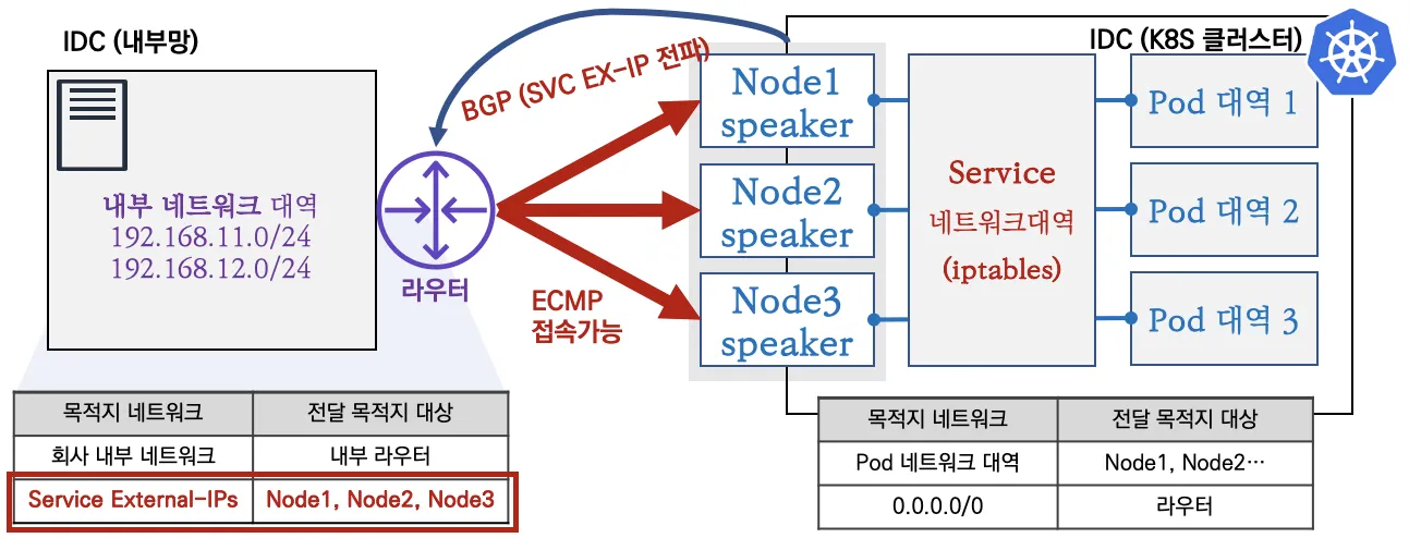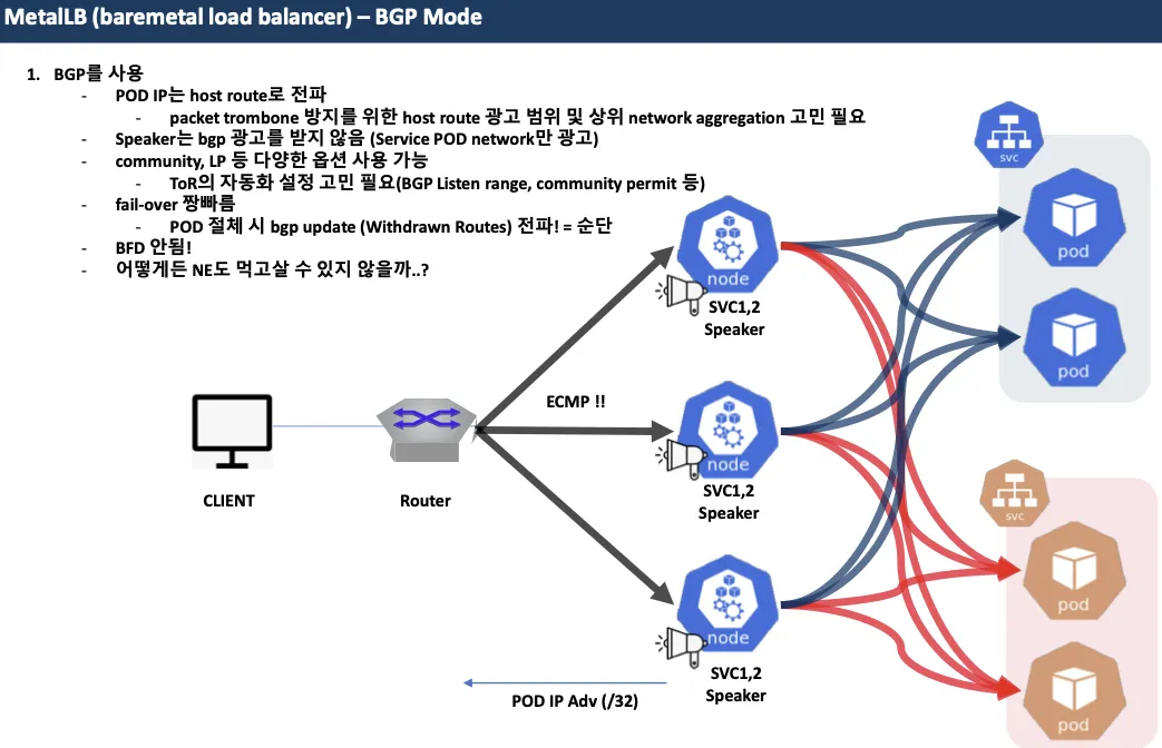 - speaker 파드가 BGP로 서비스 정보(EXTERNAL-IP)를 전파 후, 외부에서 라우터를 통해 ECMP 라우팅으로 부하 분산 접속