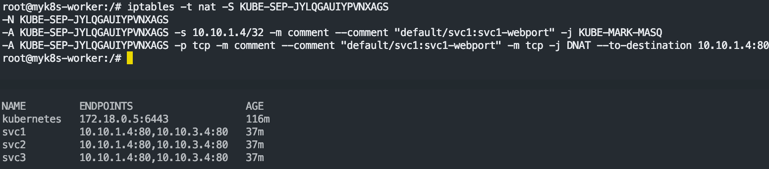 for i in filter nat mangle raw ; do echo ">> IPTables Type : $i <<"; docker exec -it myk8s-worker3 iptables -t $i -S ; echo; done