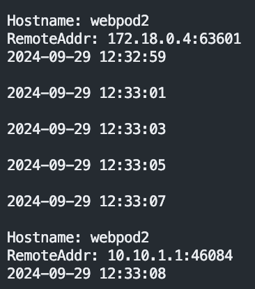 docker exec -it myk8s-control-plane curl -s --connect-timeout 1 $WPOD2 | egrep 'Hostname|RemoteAddr|Host:'