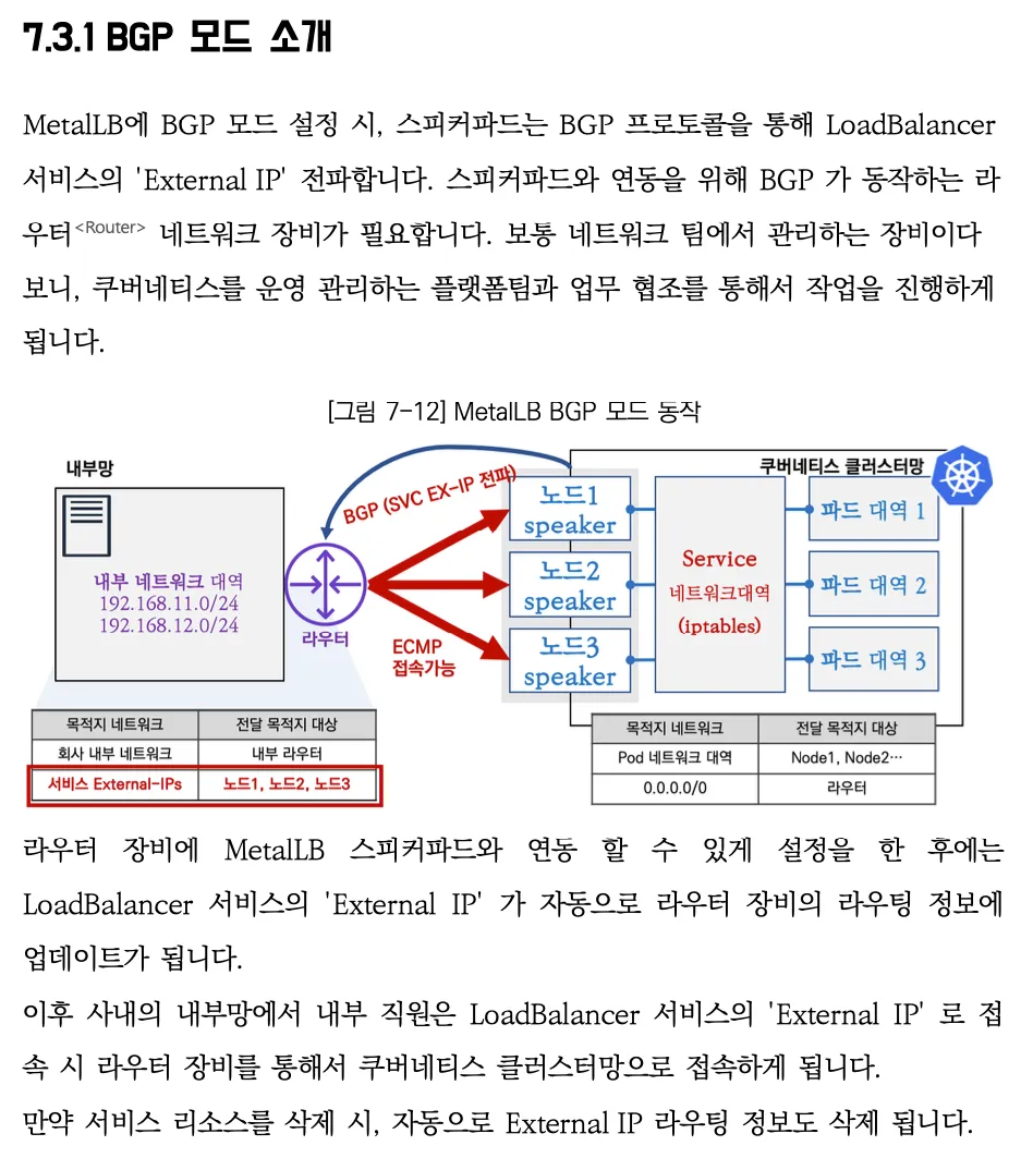 - 서비스(로드 밸런서)의 'External IP' 전파를 위해서 표준 프로토콜인 ARP(IPv4)/NDP(IPv6), BGP 를 사용합니다