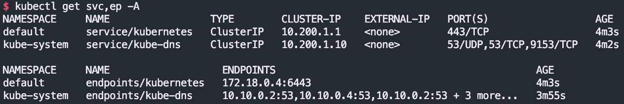 kube-system kube-dns ClusterIP 10.200.1.10 <none> 53/UDP,53/TCP,9153/TCP 3m7s