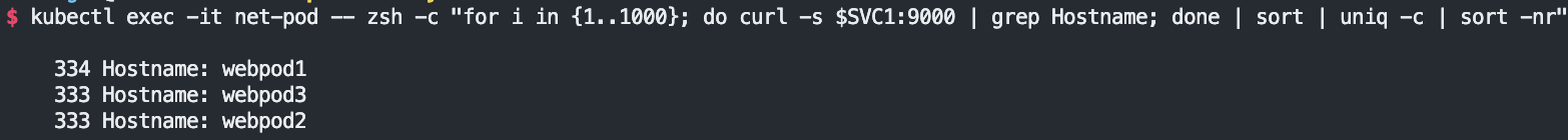 kubectl exec -it net-pod -- zsh -c "for i in {1..1000}; do curl -s $SVC1:9000 | grep Hostname; done | sort | uniq -c | sort -nr"