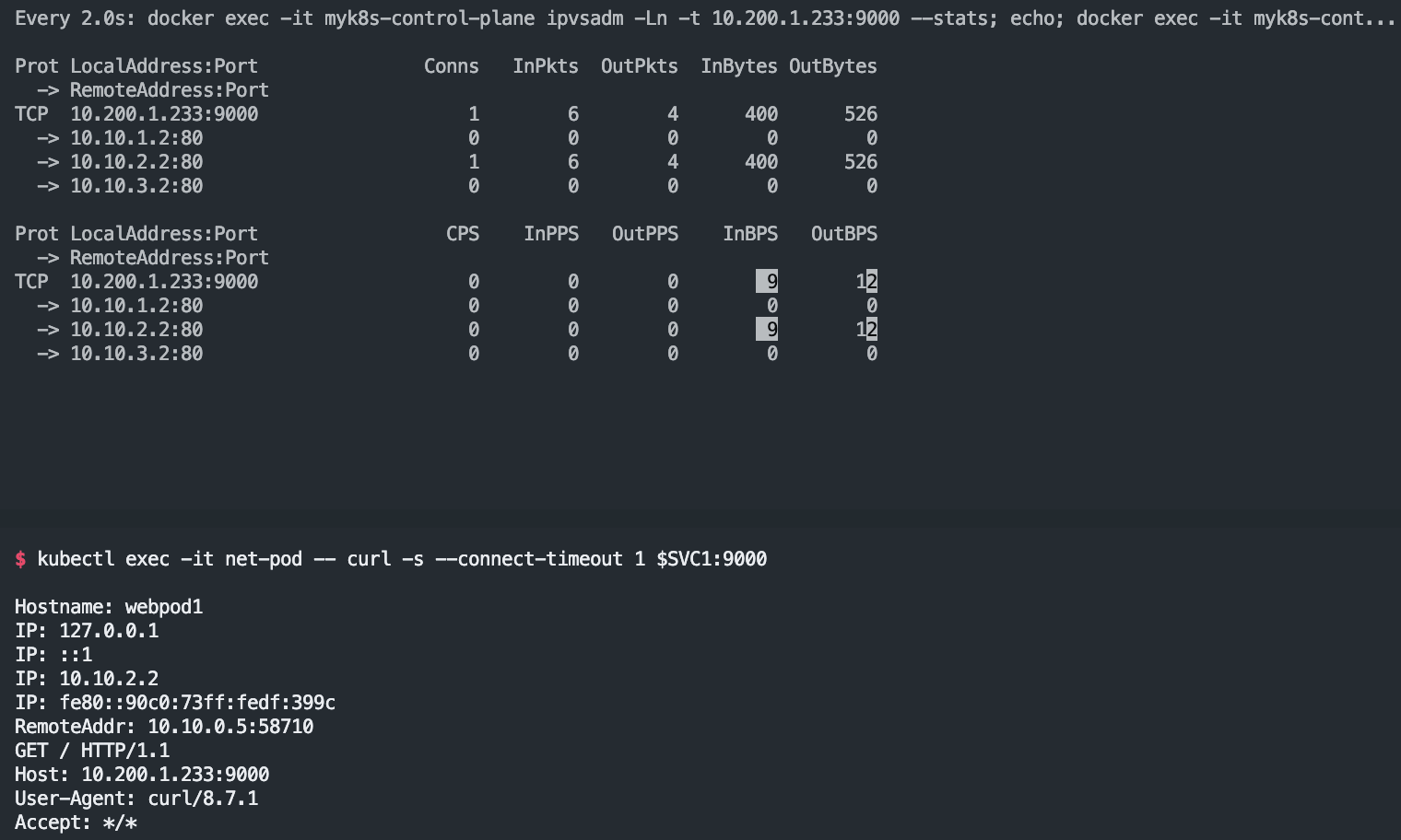 watch -d "docker exec -it myk8s-control-plane ipvsadm -Ln -t $CIP:$CPORT --stats; echo; docker exec -it myk8s-control-plane ipvsadm -Ln -t $CIP:$CPORT --rate"