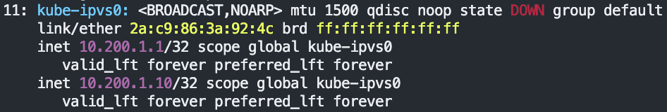 kube-ipvs0 DOWN 10.200.1.10/32 10.200.1.1/32