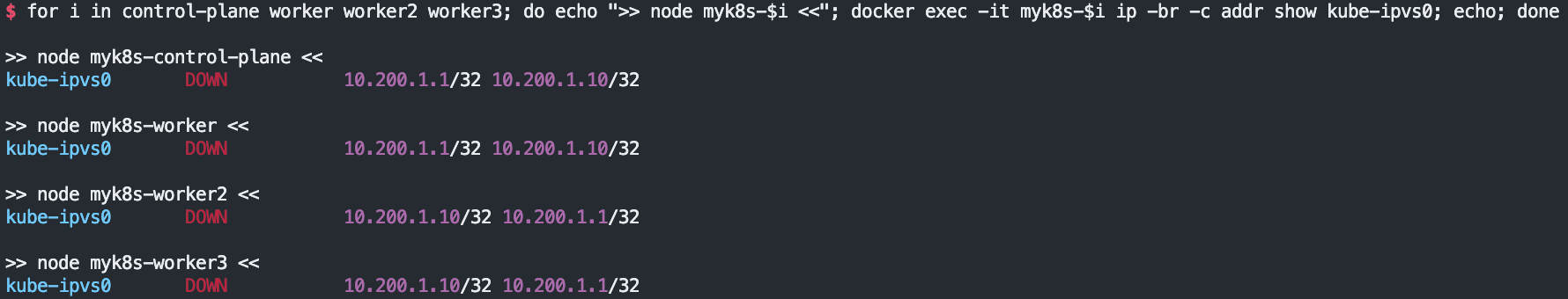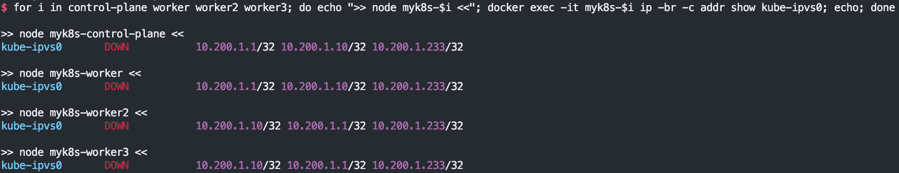 for i in control-plane worker worker2 worker3; do echo ">> node myk8s-$i <<"; docker exec -it myk8s-$i ip -br -c addr show kube-ipvs0; echo; done