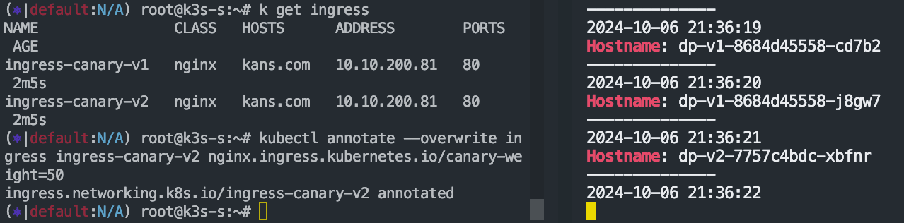 kubectl annotate --overwrite ingress ingress-canary-v2 nginx.ingress.kubernetes.io/canary-weight=50