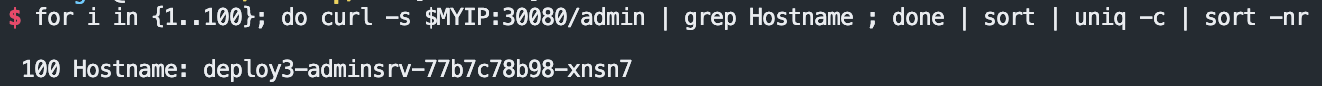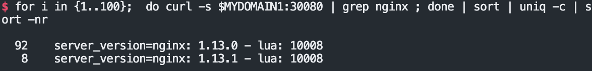 for i in {1..100}; do curl -s $MYDOMAIN1:30080 | grep nginx ; done | sort | uniq -c | sort -nr