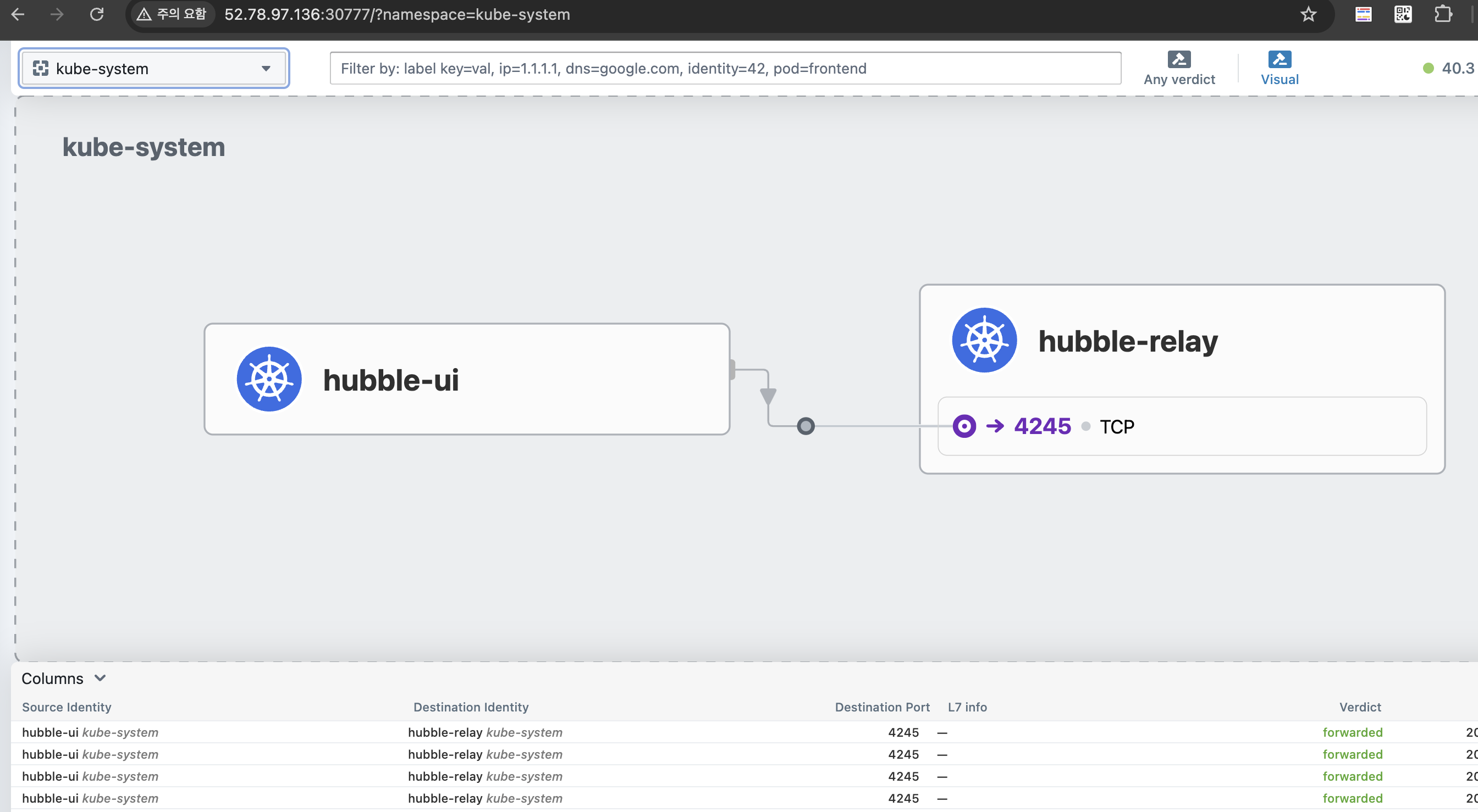 # 트래픽 발생 >> Hubble UI 에서 확인