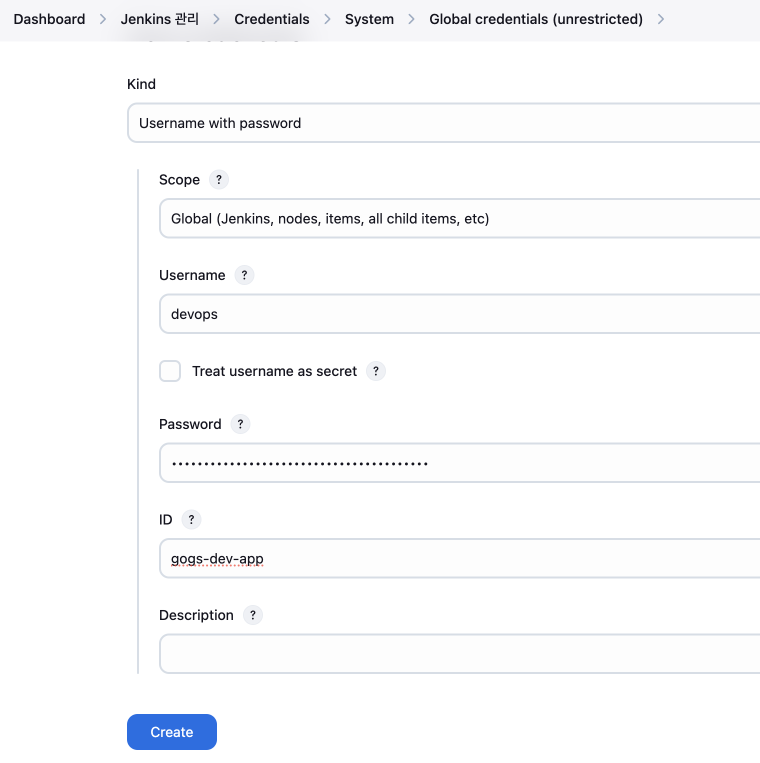 Gogs Repo 자격증명 설정(gogs-dev-app) : Jenkins 관리 → Credentials → Globals → Add Credentials