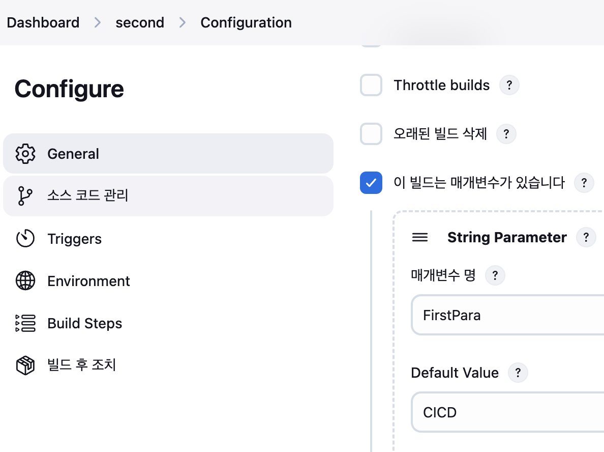 Jenkins Item 생성 : item name(second) - 소스코드관리(Git) 설정 + 빌드 파라미터