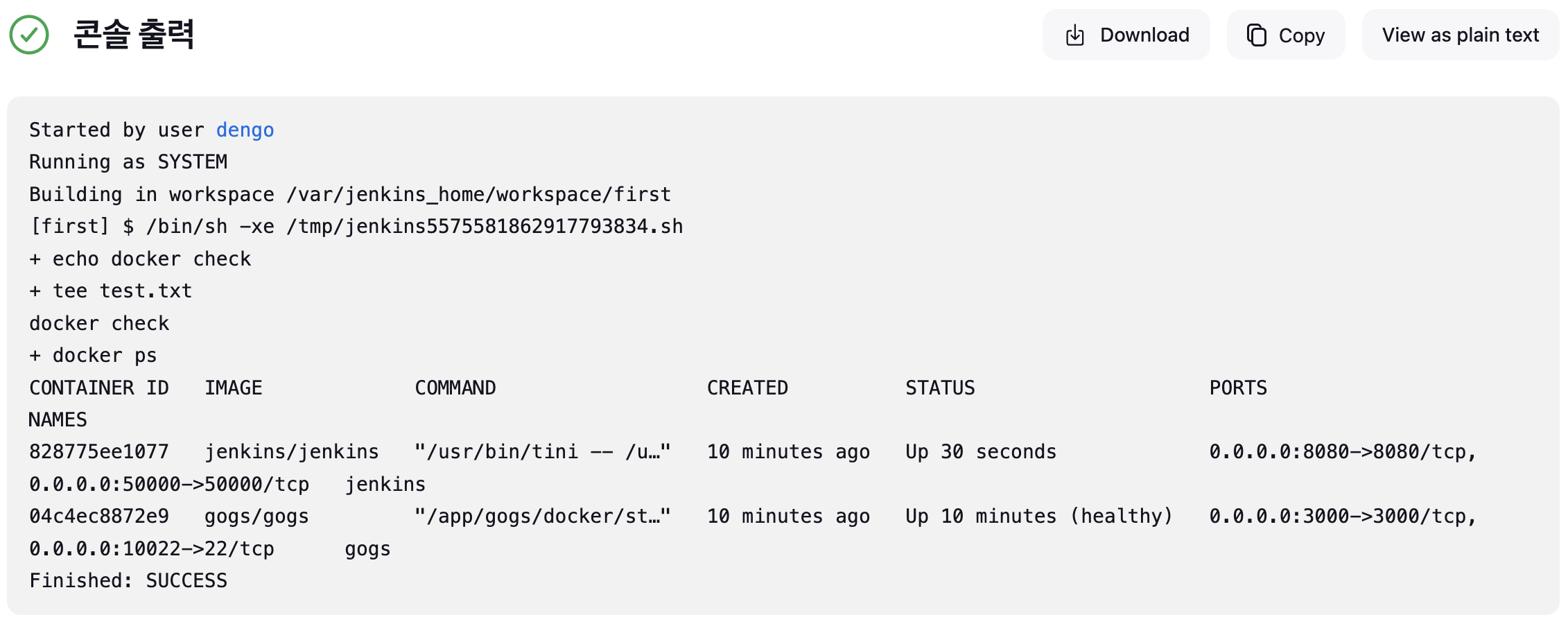 Build Steps : Execute shell ⇒ Save 후 지금 빌드 : Console Output 확인