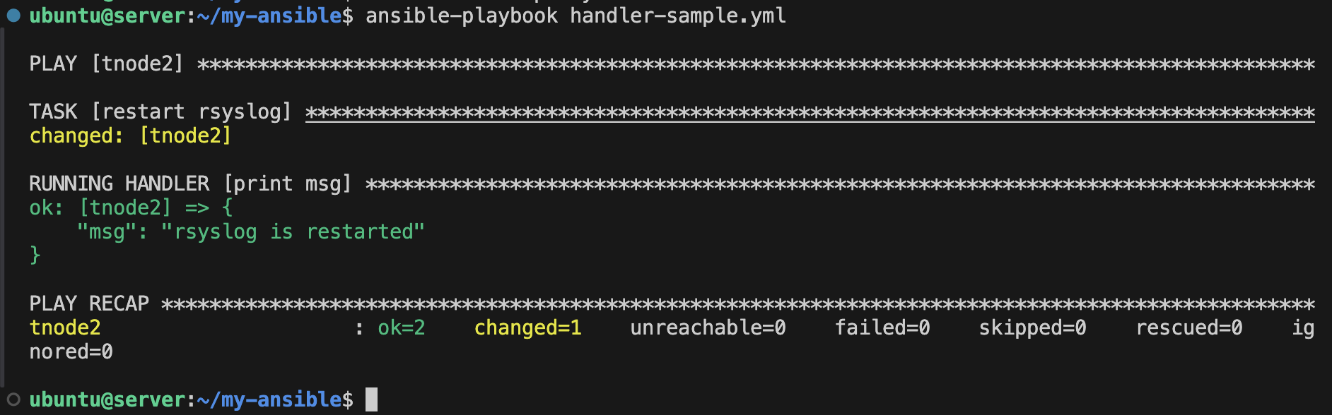 1. 플레이북 생성 : rsyslog 재시작 태스크가 실행되면 notify 키워드를 통해 print msg라는 핸들러를 호출합니다. 핸들러는 handlers 키워드로 시작합니다.